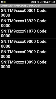 CHRYSLER TM9-Serial Decoder ialah dekoder kod radio Chrysler Panasonic untuk nombor siri T M9. Ia menyahkod kod radio menggunakan 5 digit terakhir nombor siri. Sambungan internet diperlukan dan bayaran dikenakan untuk mendapatkan kod.
