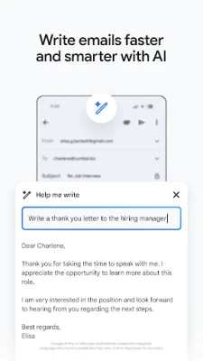 Sebagai sebahagian daripada ekosistem Google Workspace, Gmail memperkasa anda dan pasukan untuk berhubung, mencipta, dan bekerjasama dengan lancar. Hidupkan Google Chat untuk perbualan segera, manfaatkan Ruang yang dikhususkan untuk mengatur projek dan topik pasukan, serta sertai panggilan video berkualiti tinggi melalui Google Meet – semuanya tanpa perlu meninggalkan aplikasi Gmail. Tingkatkan produktiviti anda dengan ciri Balasan Pintar yang pantas dan alat pengurusan mel yang intuitif, membolehkan anda mengurus peti masuk, melabelkan, membintangkan, atau memadamkan mel dengan hanya leretan mudah.